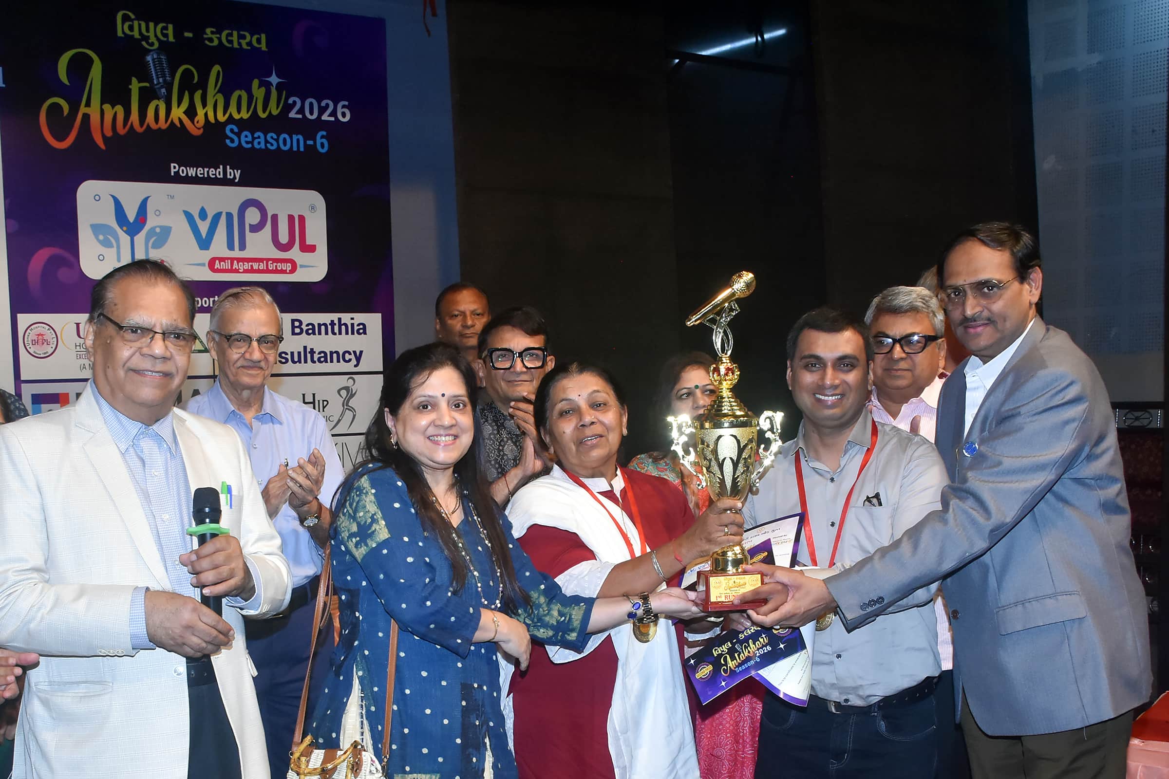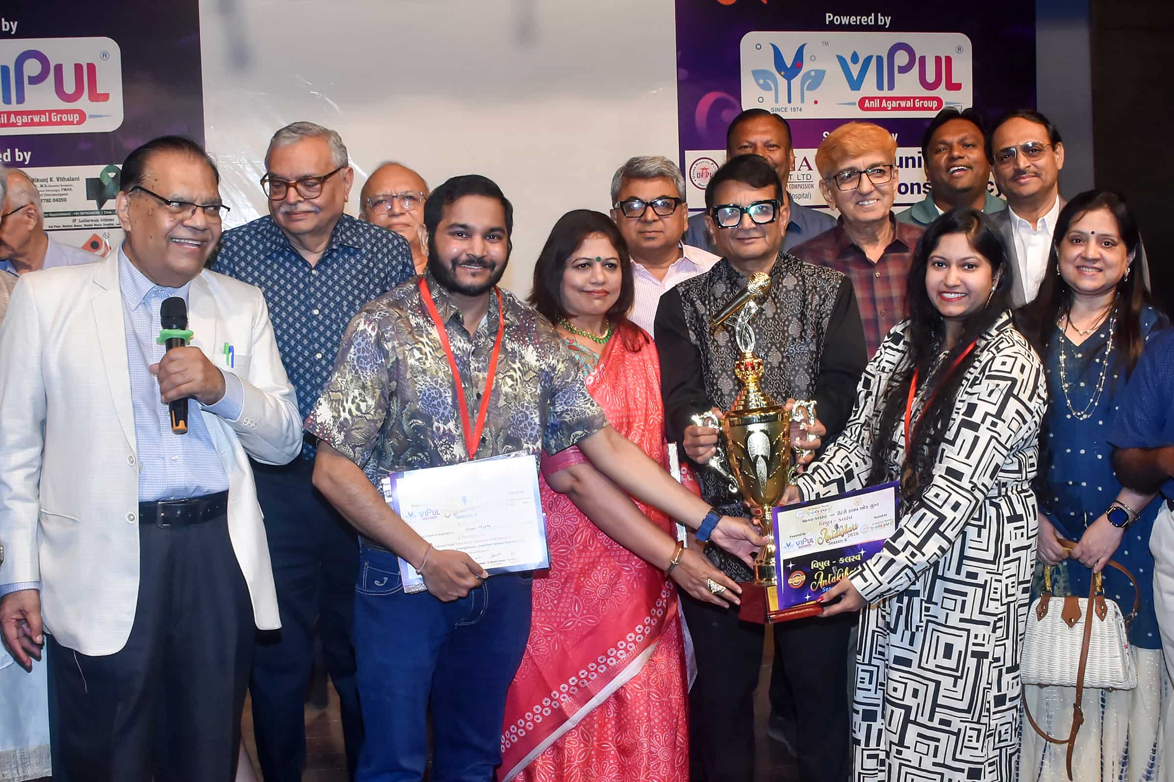 The top two positions at the Vipul Kalrav Antakshari Season 6 competition in Surat were secured by two teams from the Palanpuri Samaj, Surat this year. Brother-sister duo Niren Sanjeev Mehta and Shreya Sanjeev Mehta secured the 1st Prize, while mother-son pair Swapna Rajesh Shah and Parag Rajesh Shah secured the 2nd Prize.